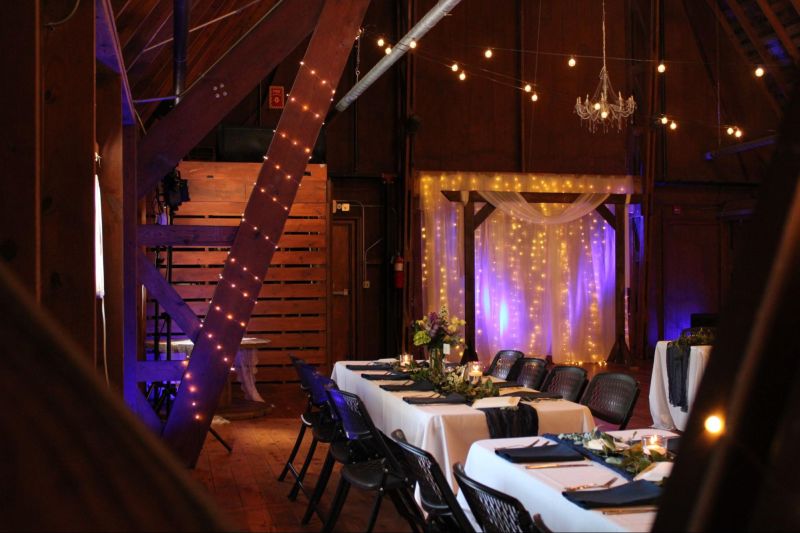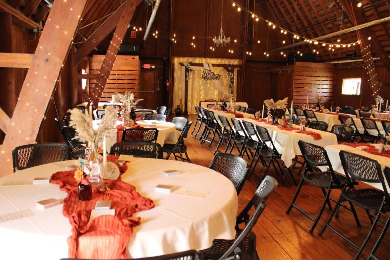 Hold your reception in the rustic R.E. Olds Anderson Rotary Barn. Our two-story barn was built early in the 20th century as a dairy barn. Renovations have retained the original beams and rustic charm, while adding radiant heating and fans for comfort; stairs and elevator provide accessibility to all guests. The 2200 square foot (36 x 63 ft) upper level with a soaring ceiling accommodates up to 150 guests at tables; an adjacent, outdoor deck provides additional space. The lower level has a long, narrow room of 1300 sq ft that is often used for cocktail hour; barn doors open onto a large patio with picnic tables. Restrooms and kitchen facilities are located on this level, along with a small room that serves as the bridal dressing room.