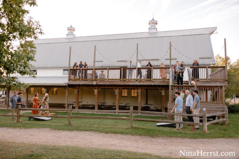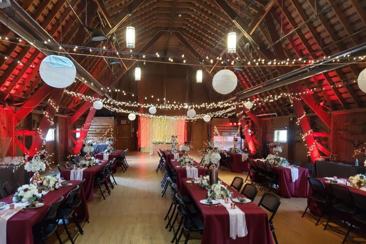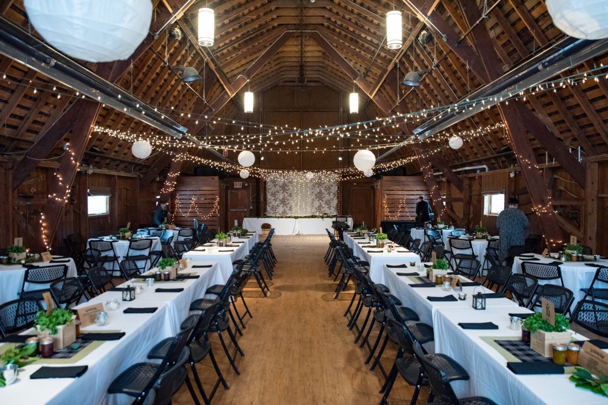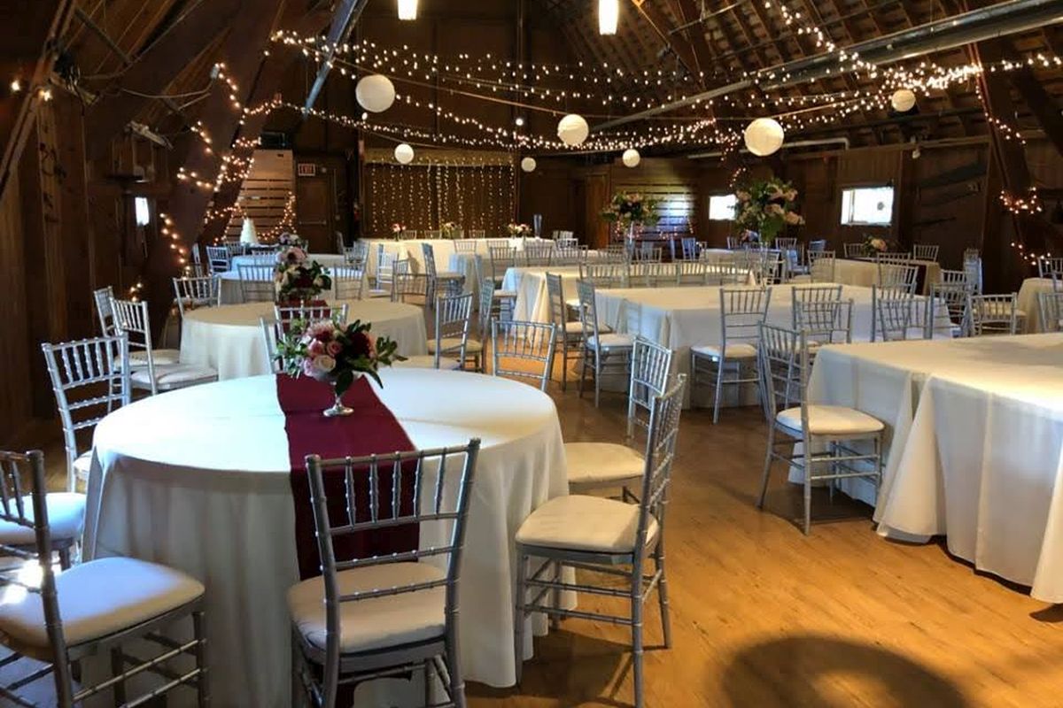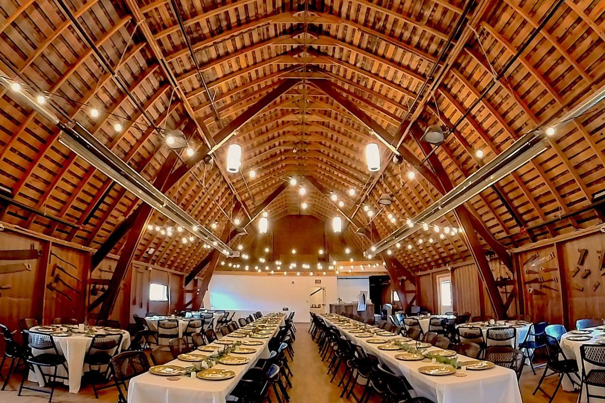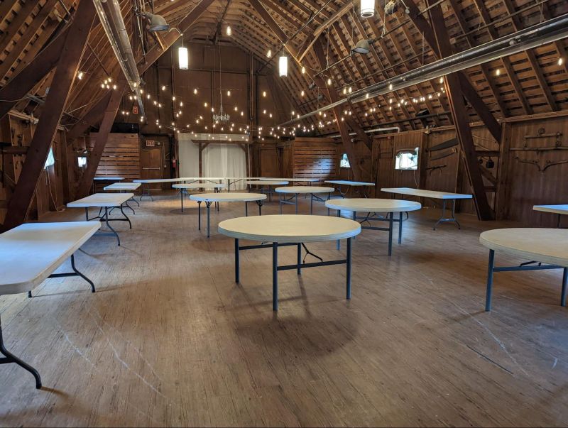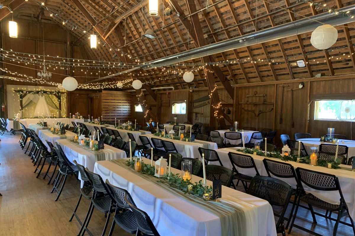 Hold your reception in the rustic R.E. Olds Anderson Rotary Barn. Our two-story barn was built early in the 20th century as a dairy barn. Renovations have retained the original beams and rustic charm, while adding radiant heating and fans for comfort; stairs and elevator provide accessibility to all guests. The 2200 square foot (36 x 63 ft) upper level with a soaring ceiling accommodates up to 150 guests at tables; an adjacent, outdoor deck provides additional space. The lower level has a long, narrow room of 1300 sq ft that is often used for cocktail hour; barn doors open onto a large patio with picnic tables. Restrooms and kitchen facilities are located on this level, along with a small room that serves as the bridal dressing room.
